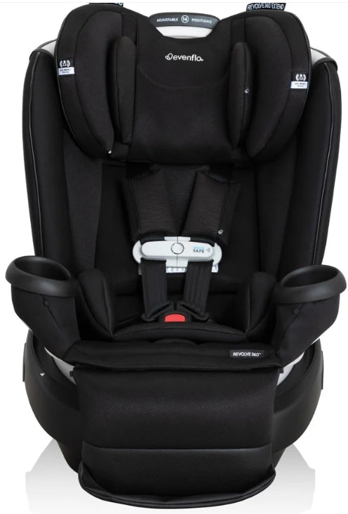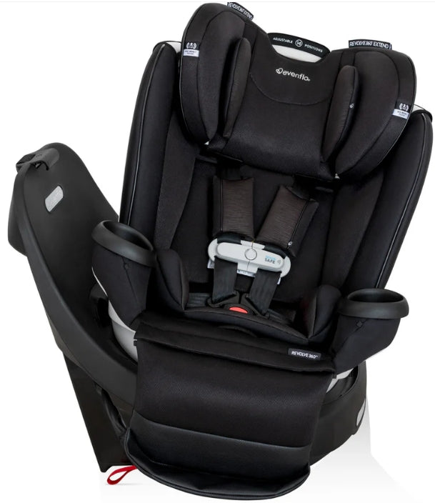 The Evenflo Revolve360 Extend, will help put your mind at ease when it comes to child car seat safety! featuring Sensor-Safe to connect you to your little one from the backseat. While your eyes are focused on the road, integrated Sensor-Safe technology alerts you in real-time to four potentially unsafe conditions from your child’s car seat via your phone: unexpected chest clip unbuckling, temperature too hot or too cold, child unattended in the car, and child seated too long. Install the seat just once for rear-facing and forward-facing modes of use — no need to remove the seat in order to make the switch. Sure360 Safety Installation System with Lock-Strong and Tether360, plus a handy bead-level indicator for leveling in seconds, make your one-time installation safe, secure and simple. The best swivel car seat is one that lasts!
